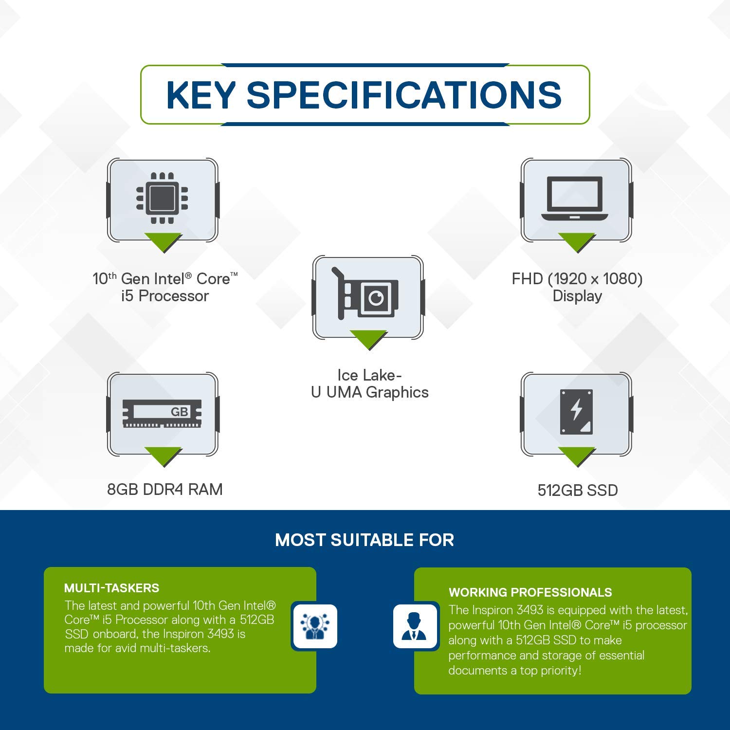 Intel i5-1035G1, 8GB DDR4, 512GB SSD, Intel UHD Graphics. Dell Inspiron 3493 Laptop (Intel i5-1035G1,8GB DDR4,512GB SSD). |
