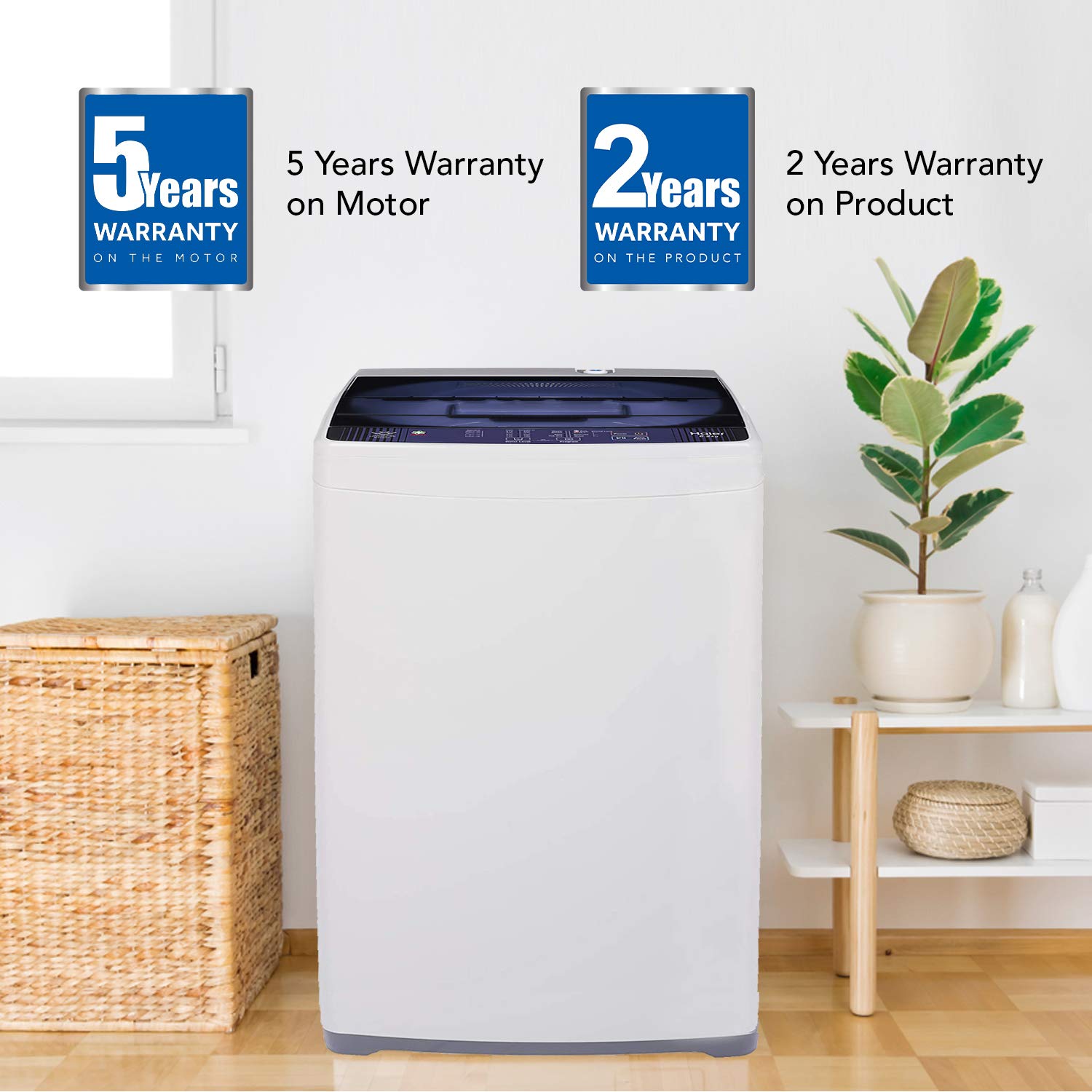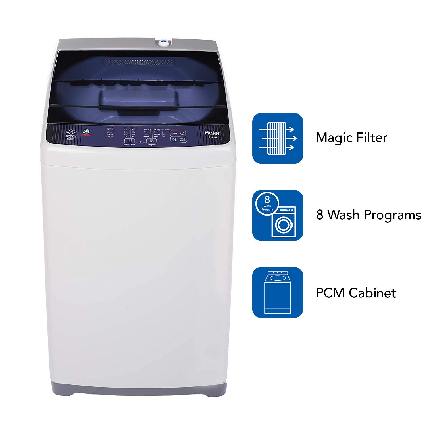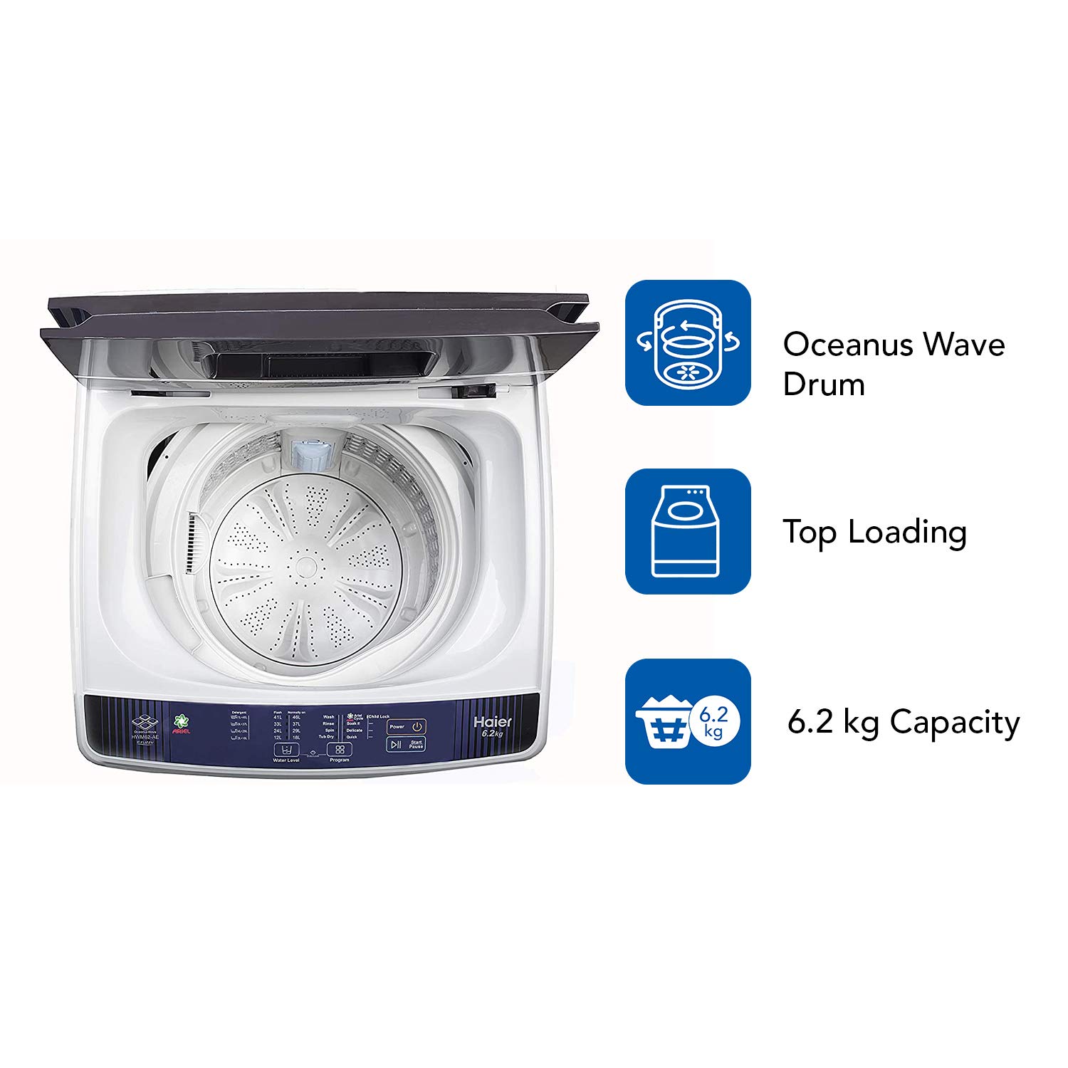 Haier Fully Automatic Top Load Washing Machine has Oceanus Wave Drum which has a unique cube designed inner tub waterfall creation which creates strong water flows , deep clean, less abrasion and more care on clothes. It has 8 different wash programs ensuring a safe and customized wash for every fabric type. Moreover, this machine comes in an ideal combination of white and blue colour. The 6.2 kg capacity washing machine comes with a 2 year comprehensive warranty on product. |