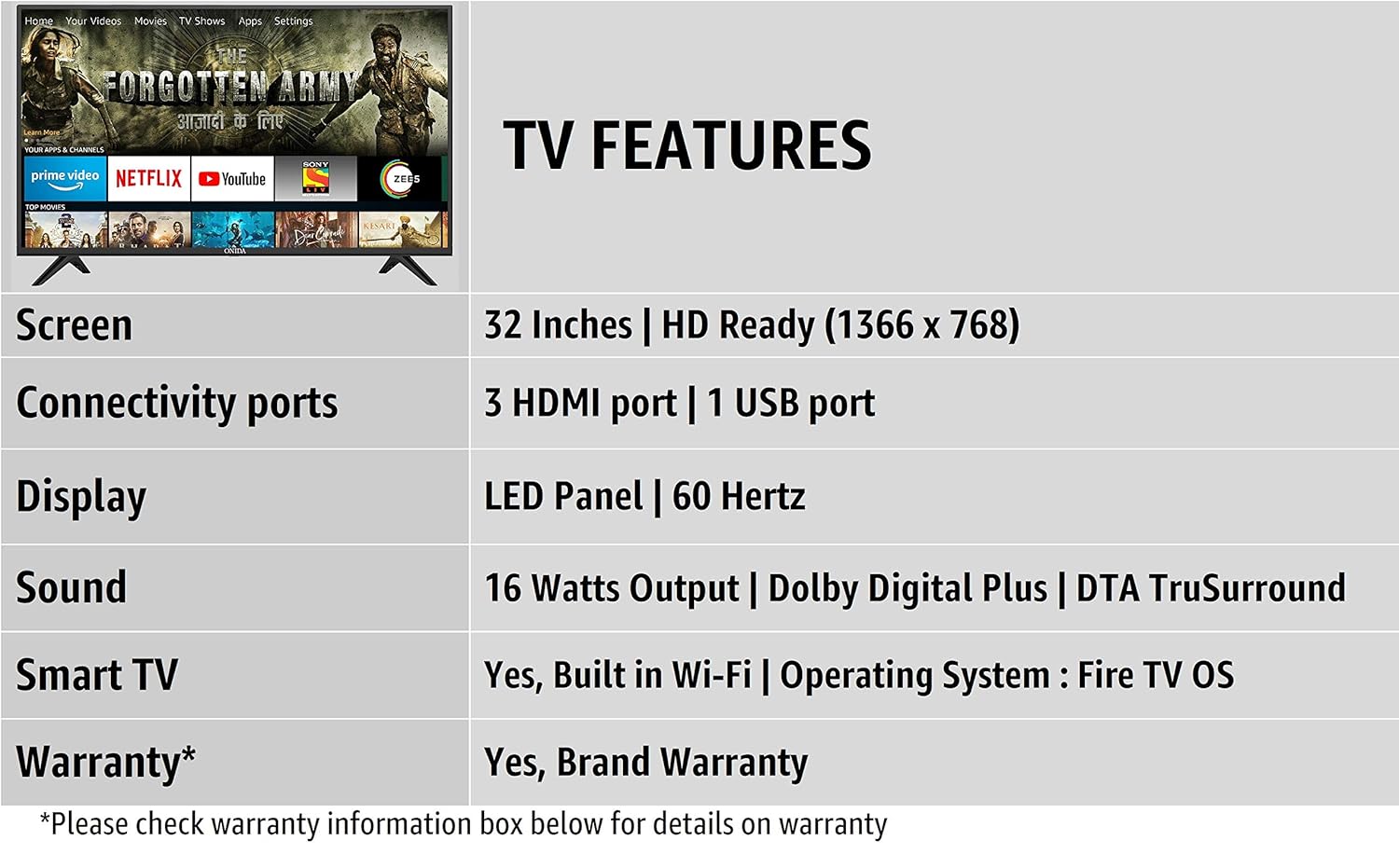 Smart TV features : Dual band Wi-Fi | Built-in Fire TV OS | Alexa Voice Control | Apps: YouTube, Prime Video, Netflix, Hotstar, Zee5, SonyLiv and more | Display Mirroring for compatible devices | Voice Remote with Alexa