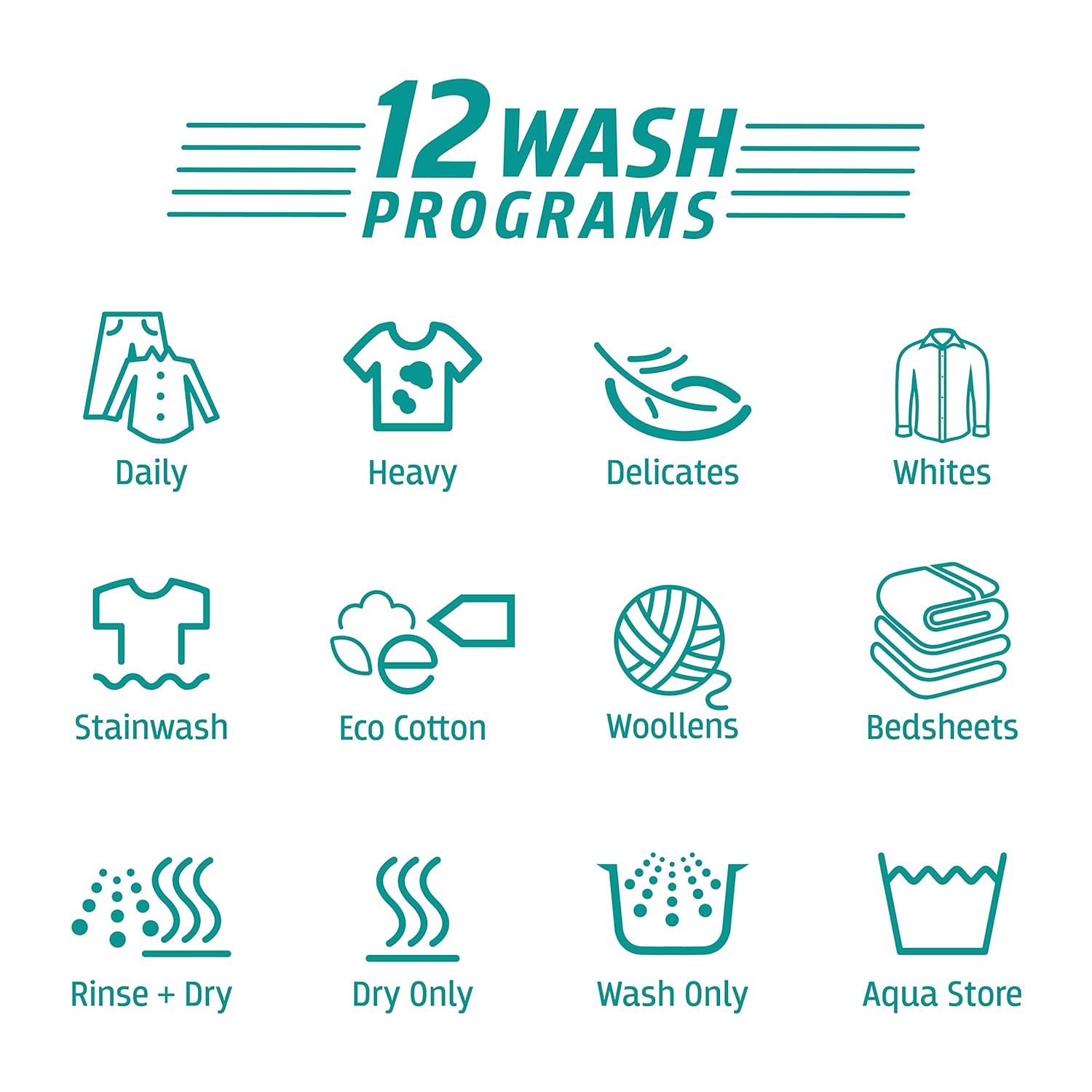 12 Wash Programs - Daily, Heavy, Delicates, Whites, Hard Water Wash, Eco Wash, Woollens, Bed Sheet, Rinse +Spin, Spin, Wash Only, Aqua Store