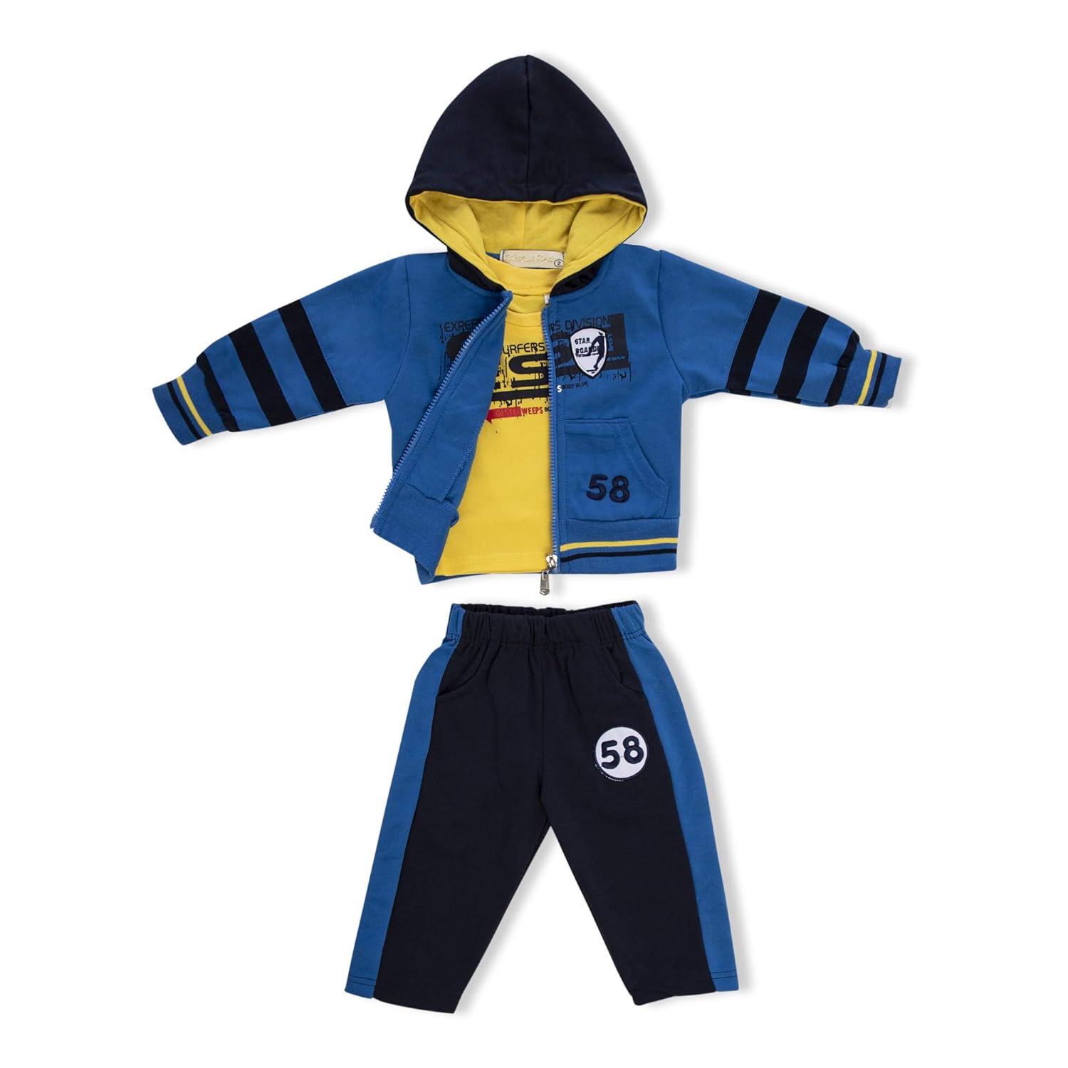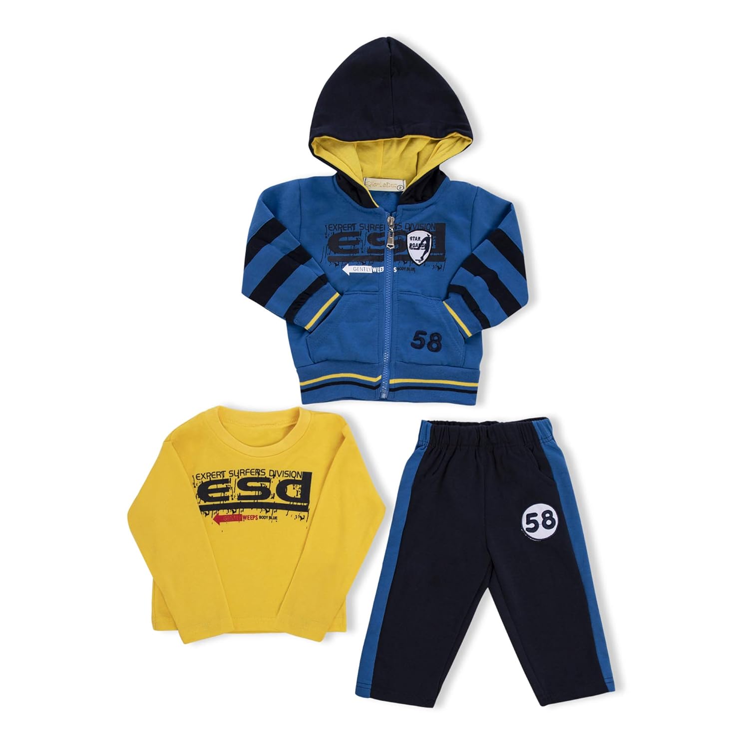 Get baby dressed and ready for stroller adventures in this bundled set thats made to layer. 3 piece t-shirt, Hooded Jacket and matching lower baby boy clothing set made of soft cotton and warm cashmere.