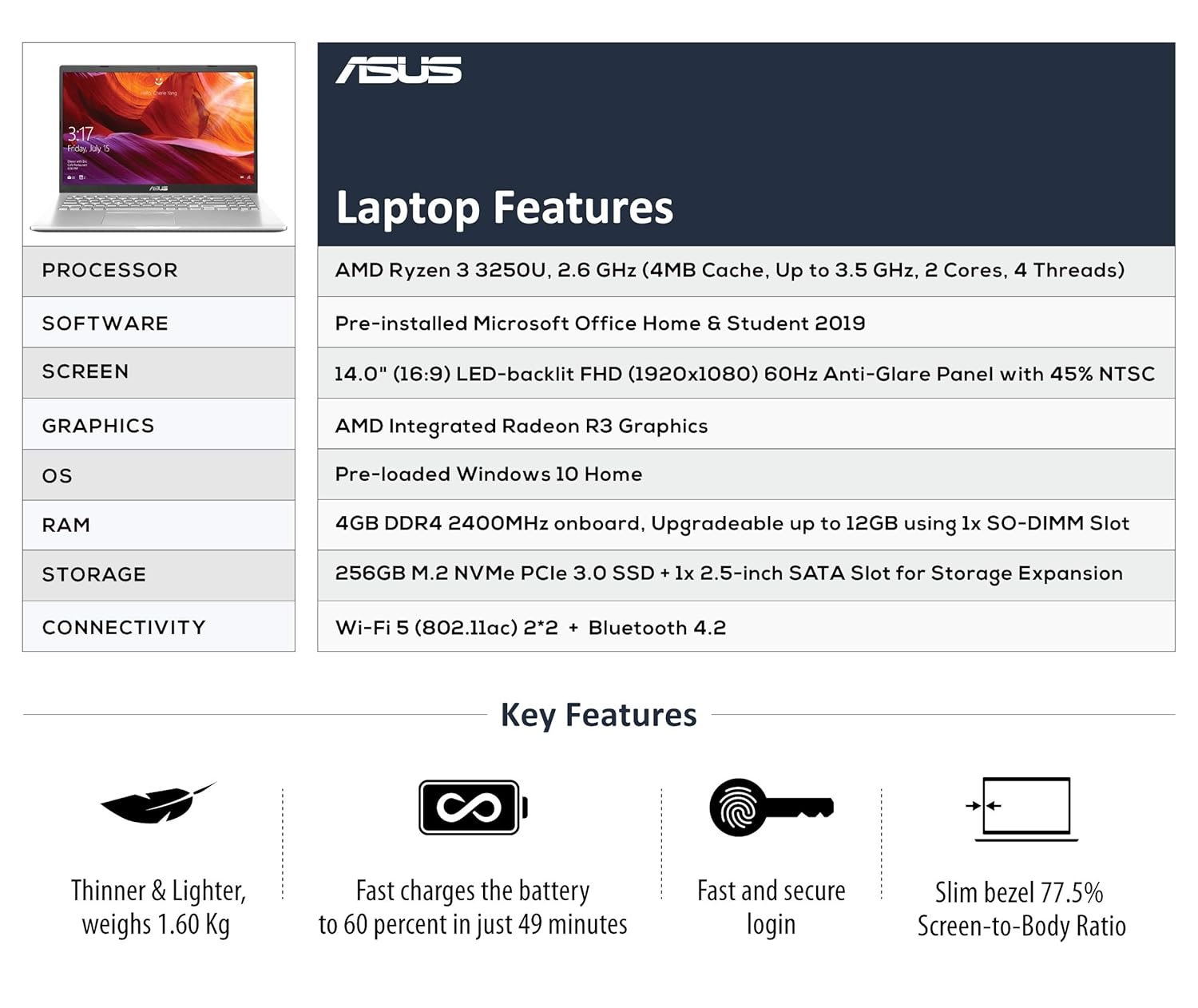 Processor: AMD Ryzen 3 3250U Processor, 2.6 GHz Base Clock Speed, Up to 3.5 GHz Max Boost Clock Speed, 2 Cores, 4 Threads, 4MB Cache