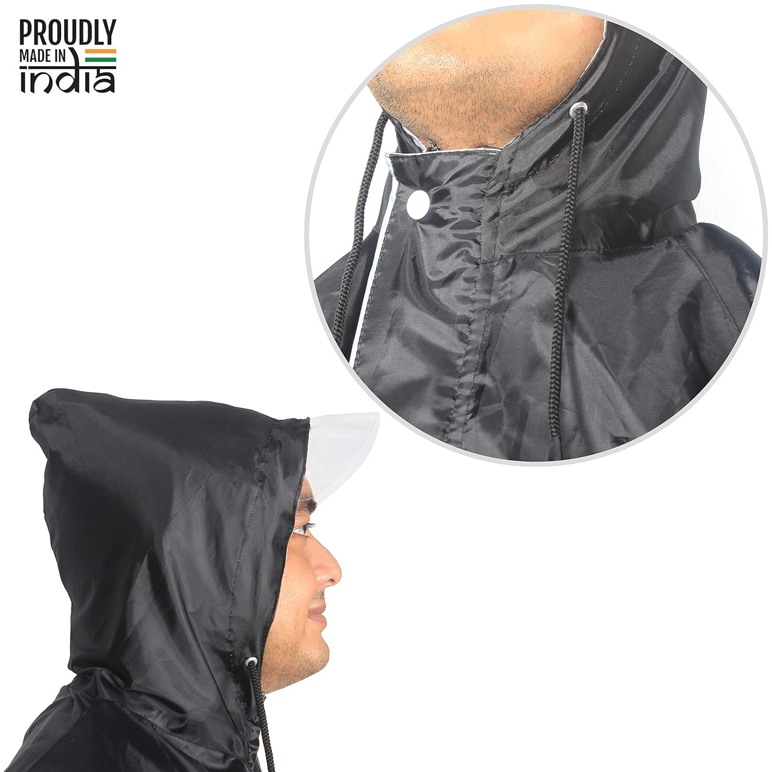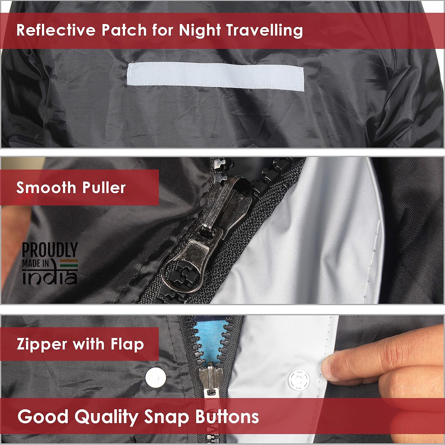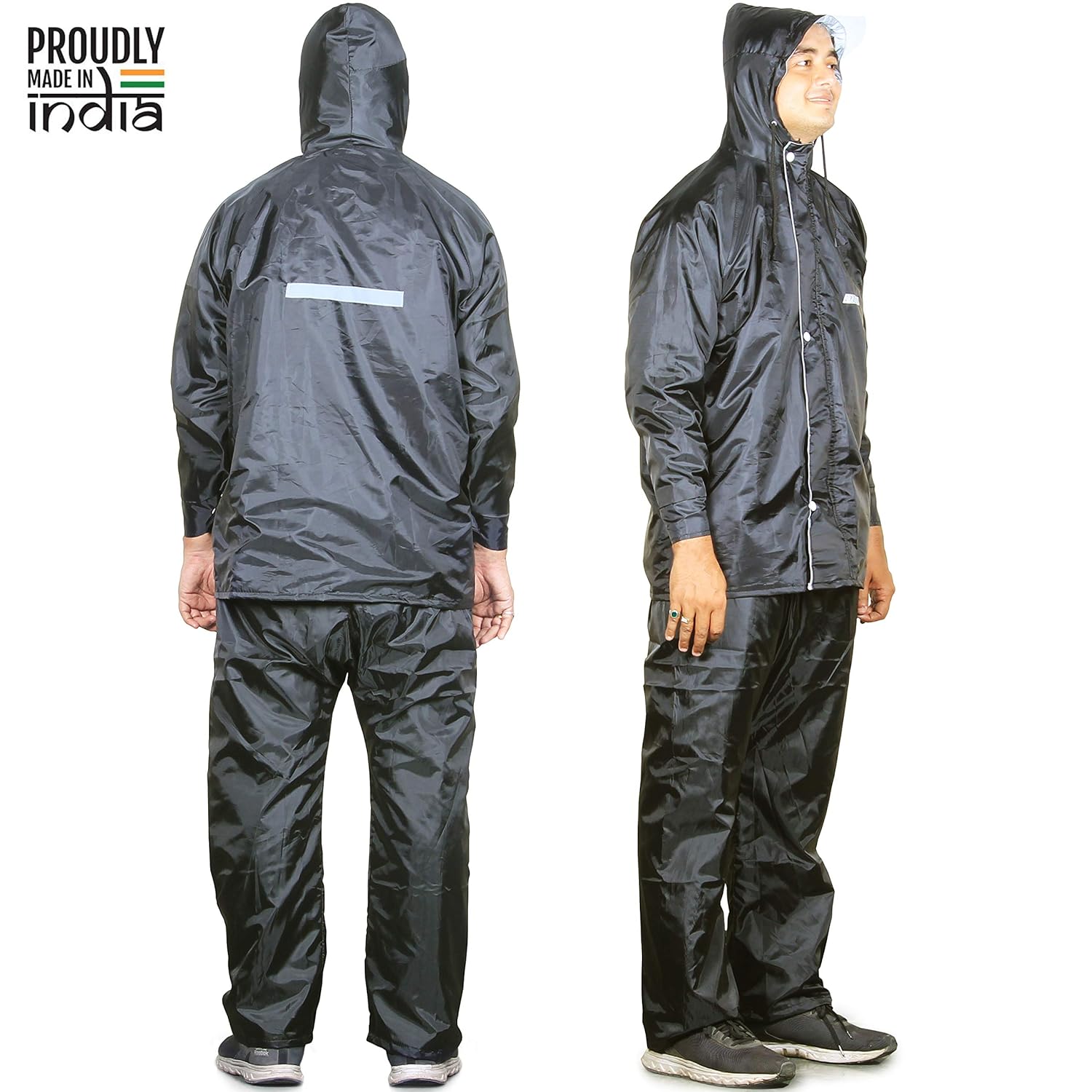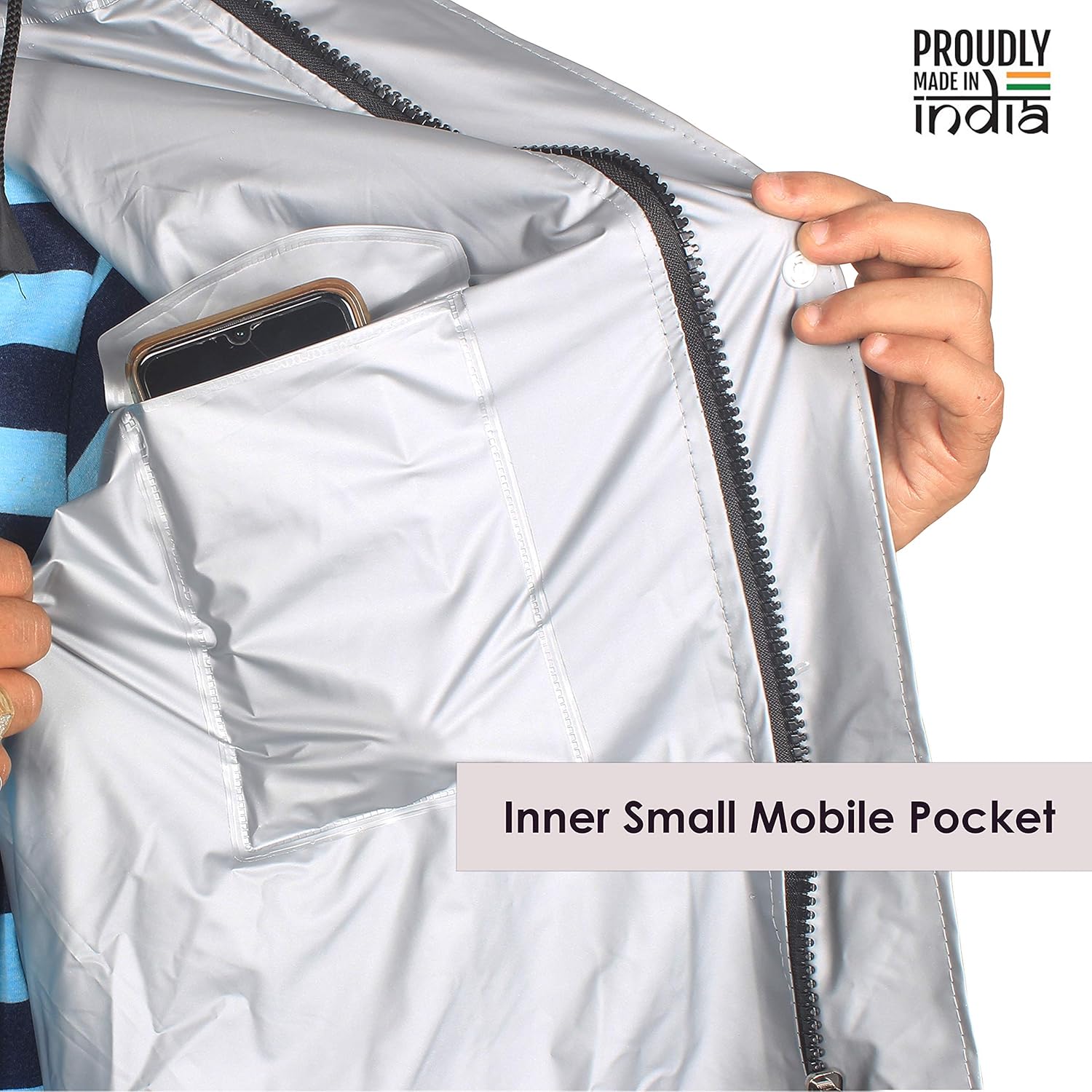 Construction: This Reversible Use Rainwear is made from double layered polyester fabric. Every joint is seam sealed with additional leak proof stitching making it completely waterproof. Overlaying flap with snap buttons over zippers prevents water seepage. It also comes with high collars and adjustable hood. Small inner pocket to protect mobile or any other expensive items.Good quality elastics in trousers makes it super comfortable to wear.